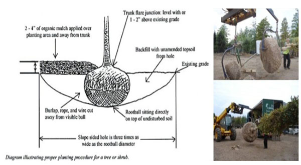 Tree root ball nets for supporting root-wrapped trees and shrubs during transit and planting. The wire netting and wrapping fabric are left around the root ball when planting. Both quickly break down in the soil.